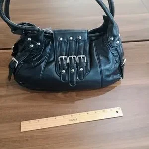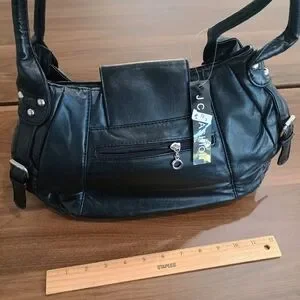 This elegant black vegan leather handbag is perfect for any occasion. Its sleek design and durable material make it a must-have accessory.