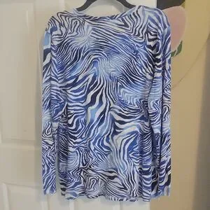 Elevate your style with this vibrant blue zebra print long sleeve top. Perfect for adding a bold touch to your wardrobe. 25" pit to pit and 29" length k16