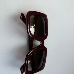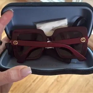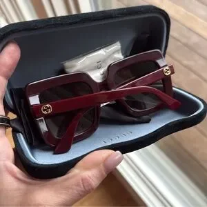Stylish Gucci sunglasses with a bold square frame. Burgundy color adds elegance. Perfect for a modern look.