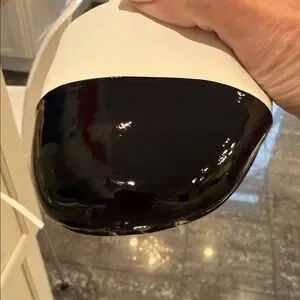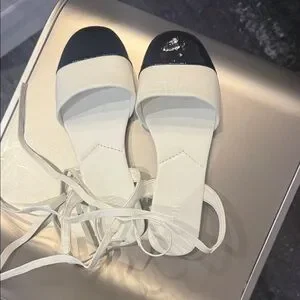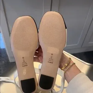 Elegant white slingback flats with glossy black cap toes. Soft white straps and ankle ties provide a secure, adjustable fit. Lightweight design delivers all-day comfort and versatile style. The black cap toe adds a polished, modern contrast to the white upper. Never worn , came with left front bottom imperfection. Not visible when worn. Reflected in price