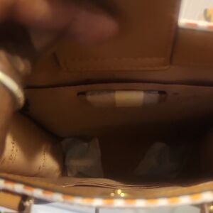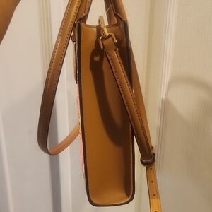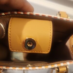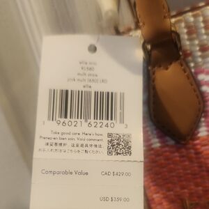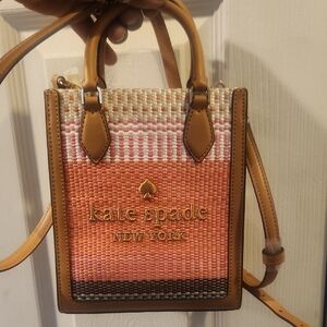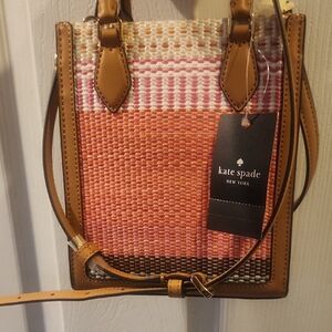 NWT Elegant Kate Spade mini bag with pink, orange, peach, and tan woven design, surrounded by tan leather. Has a tan threaded Kate Spade logo and gold hardware. Features sturdy handles and adjustable buckle crossbody strap. Ideal for versatile styling. Measures 6.25 in. x 7.5 in. x 2 in. Perfect for Spring/Summer convenient travel! Retails for $359.