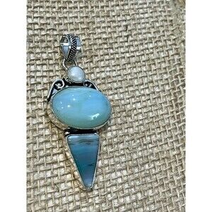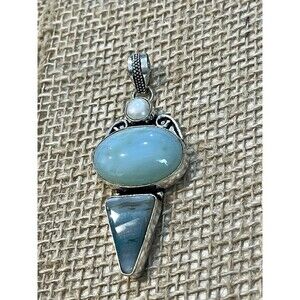 Artisan Signed Larimar & Pearl Sterling Silver Pendant Boho Southwestern