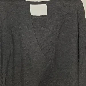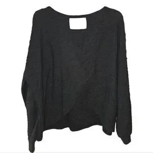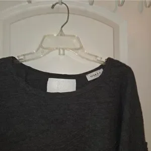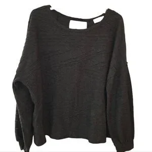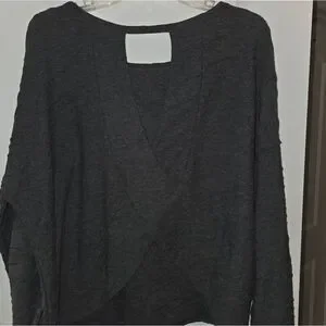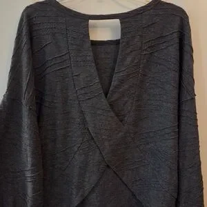 Gilli brand knit blouse in a size large. Charcoal gray in color and has a nice textured feel to the fabric. Well constructed. Back has a unique diagonal layered look design with a cutout at the back neck. Excellent condition.