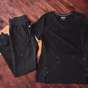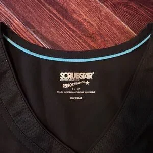 Black scrub top with blue trim. Comfortable and professional. Shirt is size S pants are XS