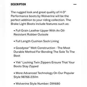 Item in Excellent PREOWNED Condition. Wolverine x Harley-Davidson collaboration, Full grain leather upper with oil resistant rubber sole, Full length cushioned Sock lining, Goodyear Welt Construction, Locking twin zippers stay up for a secure ride. NO VISIBLE WEAR.