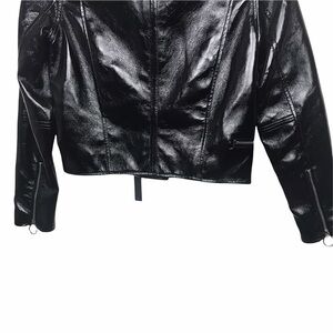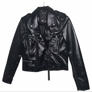 New with tags! Black, shiny faux patent leather cropped Moto Jacket. Has a spot on arm where material is bubbled but otherwise in good shape.