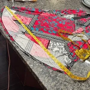 Stylish high low skirt with bold patterns. Features striking red and black design. Ideal for trendy outings.