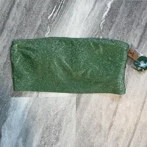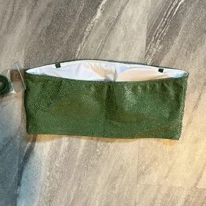 New with tags, Green Shimmer Bandeau Bikini Top size XL. Has straps to make a halter. Comes with cup pads.