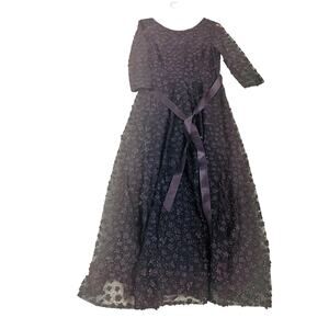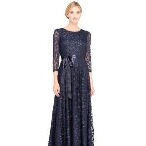 Tahari Floral Appliqué Sequin Three Quarter Sleeve Maxi Dress Size 12 Navy