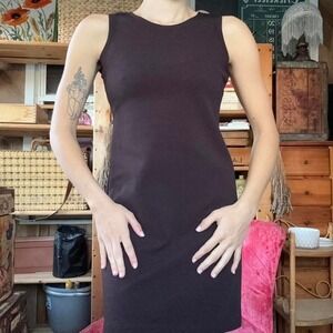 Sleeveless shift dress in a rich chocolate brown hue features a classic round neckline and a streamlined silhouette. Crafted from a textured knit fabric with a subtle stretch, this versatile piece offers a polished look suitable for both office wear and evening outings. The back is finished with a clean center seam for a tailored fit.