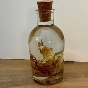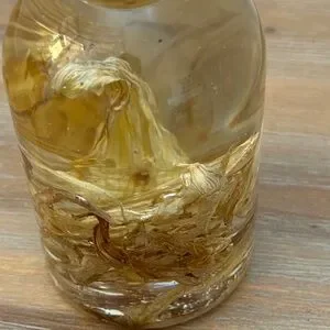 Enhance your home with this elegant decorative glass looking bottle. Featuring natural dried sunflower pedals elements, it adds a touch of rustic charm to any space. Perfect for art lovers and home decorators. This can also be placed on a light pad use as a nightlight or a soft light in the room.