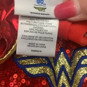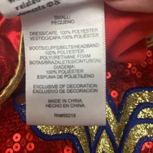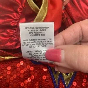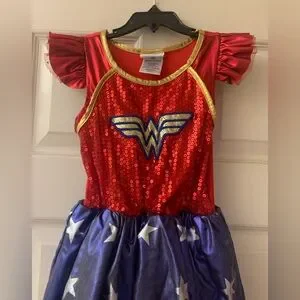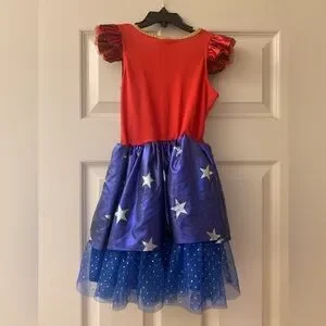 Let your child shine in this superhero costume, featuring a bold red and blue design with iconic details. Perfect for playtime and parties. The dress has sequins on the bodice and tulle on the bottom. It is a size small and measures 13” from armpit to armpit. It is 23” in length.