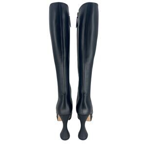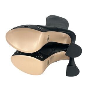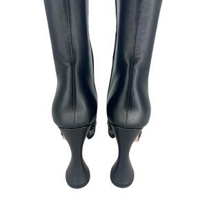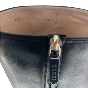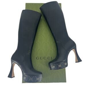 Turn heads with the Gucci Janaya Platform GG Studded Knee-High Boots, a bold statement piece crafted in polished black leather. Featuring a towering 4.75" heel and 1.75" platform, these runway-worthy boots are accented with the house’s iconic GG embellishments for unmistakable designer edge. A sleek round toe, side zip closure, and leather lining ensure both luxury and comfort. Perfect for elevating any outfit, these boots embody the daring sophistication of Gucci’s modern collections. Pair with mini dresses, leggings, or structured coats for a dramatic high-fashion look.