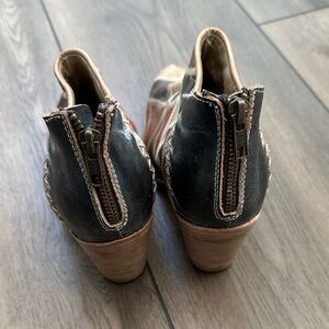 Chic Freebird leather heeled boots with a vibrant patchwork design. Features a mix of colors for a bold look. Ideal for elevating any ensemble.