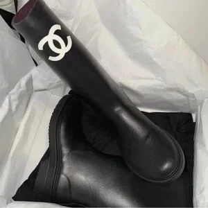 Sleek knee-high boots with prominent Chanel CC logo. Smooth black leather upper. Round toe and low block sole. Minimalist, modern design for versatile styling.