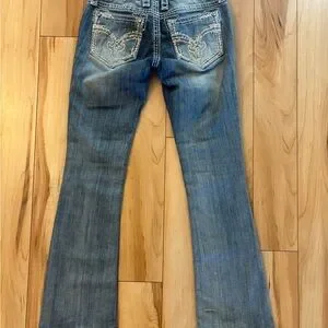 Stylish boot cut jeans by Rock Revival. Features classic blue denim. Perfect for casual wear.