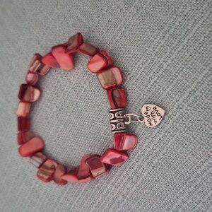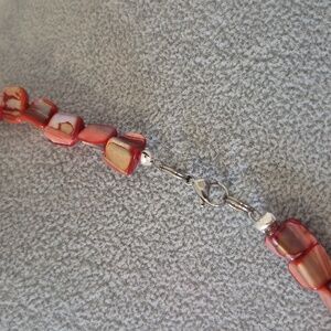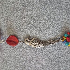 19 " Mother of Pearl Necklace with 4 1/2" Pewter Parrot Drop.7" Braclet, Earrings 2" Necklace is strung on Stainless steel jewelry wire. Closure is Stainless steel non tarnish. Parrot is Pewter.Braclet is strung on heavy duty jewelry cord. Charm is Stainless steel non tarnish. Earrings are Sterling Silver.