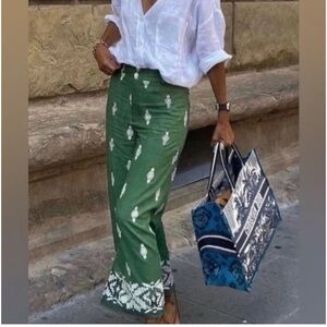 Stylish green trousers with white geometric patterns. Comfortable fit. Perfect for casual wear.