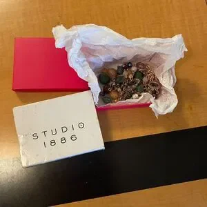 Elevate your jewelry collection with this stunning multi-strand statement necklace from Studio 1886. This piece features a sophisticated blend of earthy and vibrant tones, including forest green, amber, plum, and marbleized cream beads.