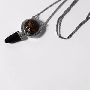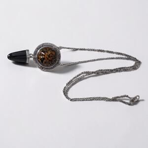 Sterling silver featuring amber tone resin cabochon with black onyx dangle in medallion style