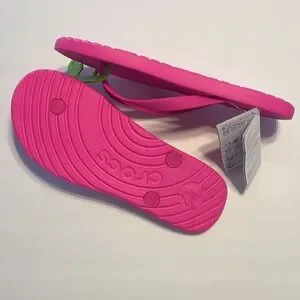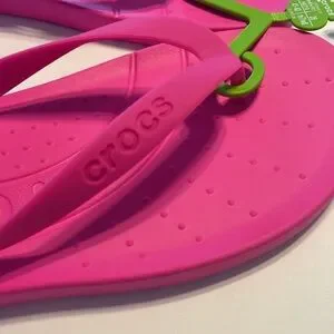 Vibrant pink Crocs flip flops. Comfortable and stylish for casual wear.