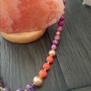 Studio Barse necklace with vibrant purple and coral beads. Gold-tone round accents add shine. Features a marbled teardrop pendant focal. Easy-to-wear clasp. Bold, colorful accessory.