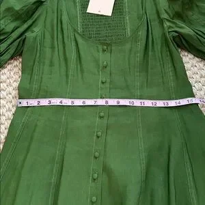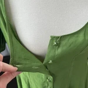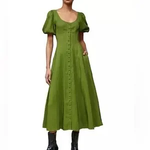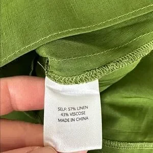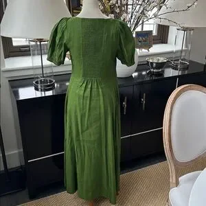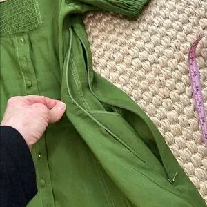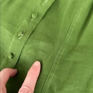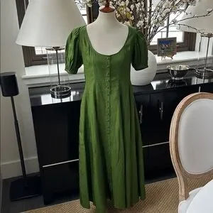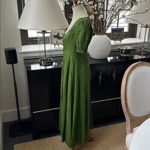 Beautiful green linen and viscose maxi dress. Side zipper, goes on over the head (the buttons are mostly decorative). Very nice ‘hand’ feels a bit like raw silk.