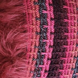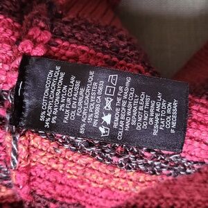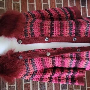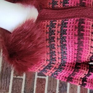 3/4 sleeve chunky jacquard knit cardigan with hidden snap closure & detachable faux fur collar in red. Ribbed trim, side split hem. EUC, minimal wear. Unique piece! Cotton blend. Hand wash. Size large. Pit to pit 19", length 23".