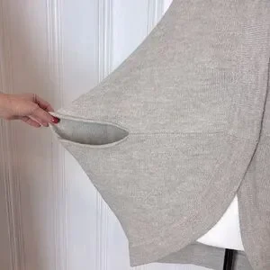 Designed with a cape-like silhouette, it features two armholes for comfort and functionality, with no sleeves for an effortless poncho-style fit. The front opens in a soft V-shape and is slightly rounded, while the back is slightly longer for added coverage and elegance.