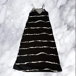Flowy black maxi dress with white abstract stripe pattern and adjustable spaghetti straps. Lightweight stretchy fabric with a relaxed fit that drapes nicely.