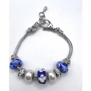 blue bracelet, charm bracelet, bead bracelet, adjustable bracelet, fashion bracelet, rhinestone bracelet, women's jewelry, silver tone bracelet, pandora style, gift for her