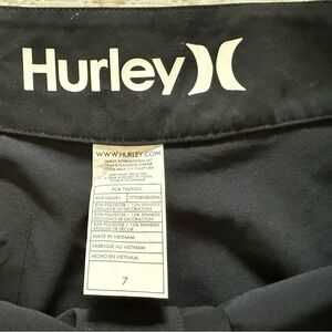 Hurley micro board shorts in solid black with large white Hurley logo. Simple, sporty design for beach or pool. Lightweight fabric with stretch.