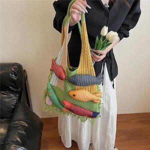 *This single-shoulder bag is a visual poem of summer, carrying the ocean's romance on your shoulder. Five hand-woven, colorful fish swim across the mesh surface of the bag, as if they've just leaped out of the Mediterranean Sea, bearing the warmth of the sun and the lively spirit of the waves. The scales, interwoven with hues of green, blue, yellow, and red, shimmer slightly with every step, resembling a glistening sea surface.