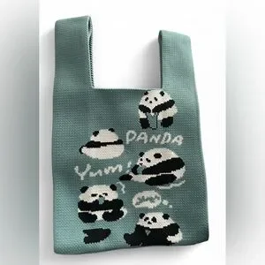 Adorable knit tote bag featuring playful panda designs. Perfect for casual outings.