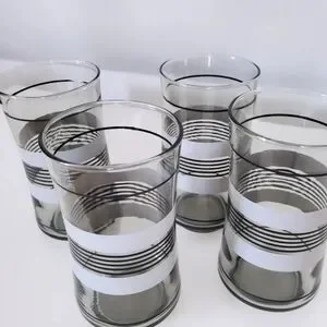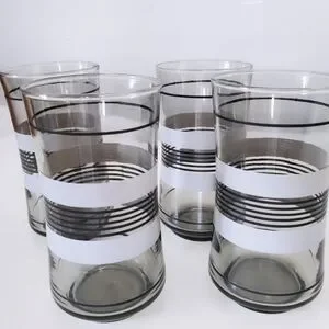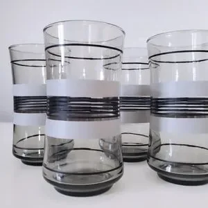 Vintage Libbey Bolero smoke glasses from the 1970s featuring a bold black and white striped design. These glasses are a striking example of mid-century modern barware, combining smoky glass with a graphic stripe pattern that feels both retro and timeless.