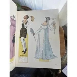 This pre-owned Dover Publications "Glamorous Movie Stars of the Sixties Paper Dolls" book by Tom Tierney features a pink cover with illustrations of three paper dolls. Inside, the book contains various paper dolls and their outfits, including figures like Rita Hayworth and Natalie Wood. Visible pages show cut-out paper dolls and clothing, indicating some use. The book measures approximately 9.5 ounces on a digital scale, suggesting a paperback format.