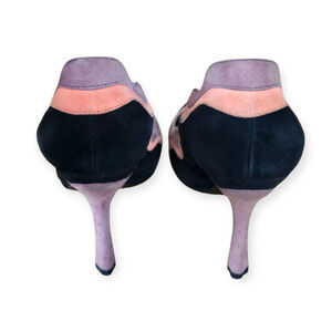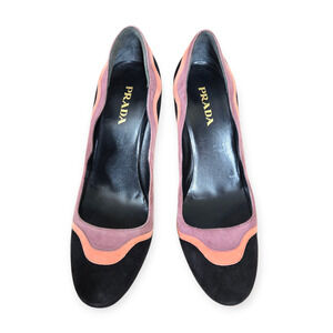 Elevate your wardrobe with these spring 2008 fairy collection Prada Camoscio Y2K Pink Purple Black Suede Wave Pumps in IT 39 / US 9. Crafted in Italy from rich suede, this rare color‑blocked pair features a scalloped wave trim, a round toe, and a sleek 4.5" heel that blends feminine curves with early‑2000s runway energy.