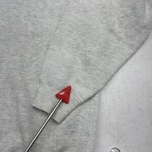 Previously worn sweatshirt with light overall wear from normal use and laundering. Small faint marks are present on one sleeve near the cuff and on the front sleeve area as highlighted in photos. Rib knit collar, cuffs, hem, and printed graphics are intact with no holes or tears.