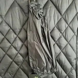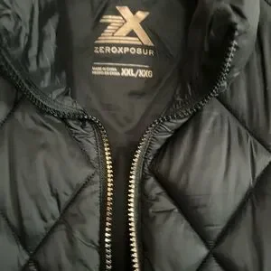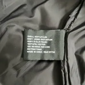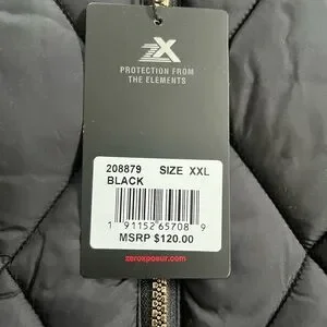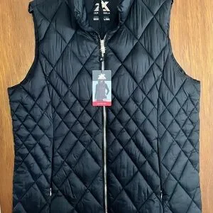 Quilted sleeveless vest with full front zipper. Subtle logo at neckline. Shiny metal zipper detail. Smooth, solid black fabric. It’s packable with the bag provided. Pit to Pit: 24, Length: 30. So soft!