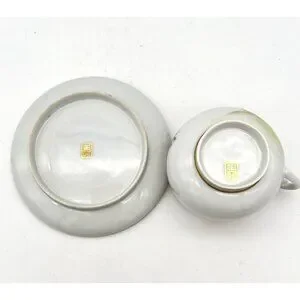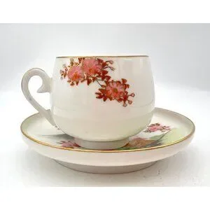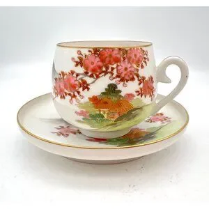 This elegant Japanese teacup and saucer set captures the serene beauty of cherry blossoms in full bloom, accented with delicate gold gilding. Peer inside the cup to discover a lithophane portrait of a Geisha, adding an enchanting touch to your tea rituals. A unique addition to any collection.