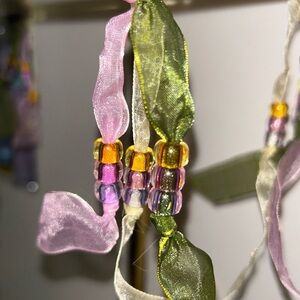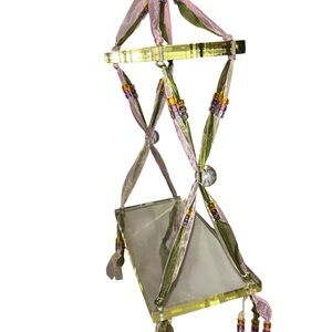 This is absolutely beautiful and so feminine and adorable. It’s so many different fabrics and textures on this doll and the swing has two levels and it is a thick, nice heavy acrylic but not too heavy to hang. The ribbon is light, pink and green and the same color of the beads. I found it in the closet not sure how old it is, but I know it’s at least 15 years old.