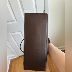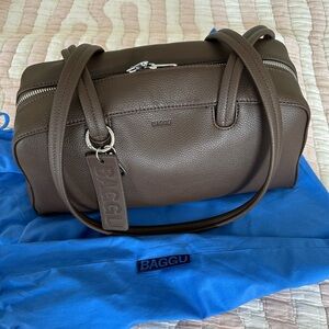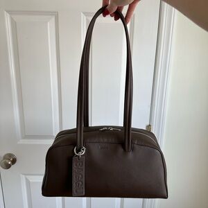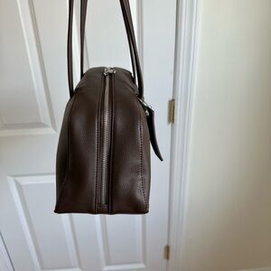 Structured shoulder bag in rich dark brown pebbled leather. Dual straps for over-shoulder wear. Top zip closure keeps items secure. Detachable branded BAGGU tag adds designer detail.