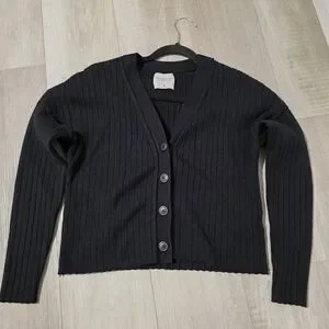Chic black ribbed cardigan. Features button-up front. Ideal for layering.