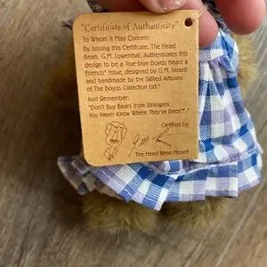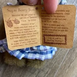 Boyds Bears & Friends Sugar Beary Jam plush mocha bear is a delightful addition to any collection, originally released as part of the 2004 loyal collectors' club kit. This charming teddy bear comes dressed in a blue and purple gingham sundress with matching bows and white pantaloons. A standout detail is the small white pocket on her dress featuring a beautifully embroidered raspberry, perfectly complementing her berry-picking theme. This handmade collectible includes its original hangtag and certificate of authenticity, signed by G.M. Lowenthal.