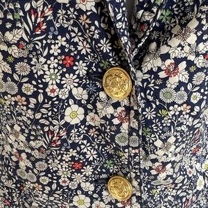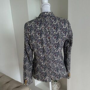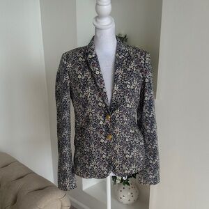 Stylish floral blazer with a classic fit. Features a black and cream pattern. Ideal for versatile wear.