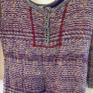 This gorgeous Free People mini dress features a vibrant purple and blue zig-zag textured knit. The Henley-style button front and 3/4 sleeves give it a relaxed, bohemian vibe. Made from a soft rayon-cotton blend, it’s lightweight enough for spring but easily layered for cooler weather. Can be worn as a short mini dress or a longline tunic over leggings