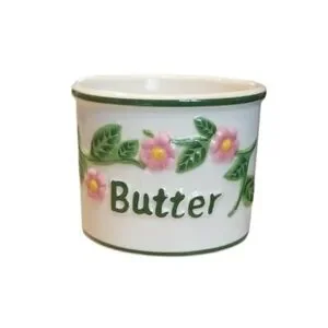 Elegant butter crock with pink floral design and green accents. Ideal for kitchen decor.