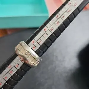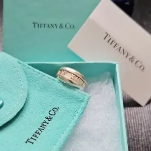 Tiffany & Co. ring featuring a polished silver band with Roman numeral inlay. Elegant, clean, timeless style and design. Ring is a size 6, but might fit 5.5 or 5 3/4 more comfortably as it's wide. Weighs over 9 grams. Purchased at the Tiffany boutique in the former Ottawa Holt Renfrew.