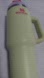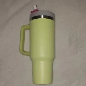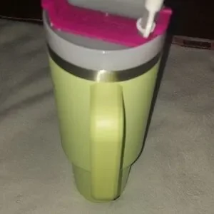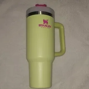Vibrant Stanley travel mug. Neon green body with pink logo. Features a sturdy handle and secure lid.