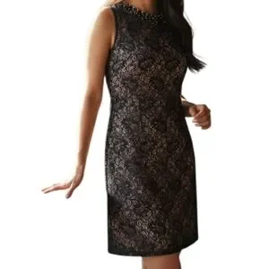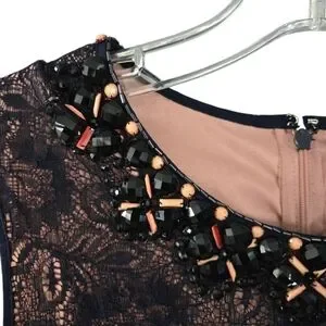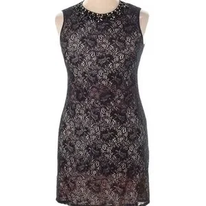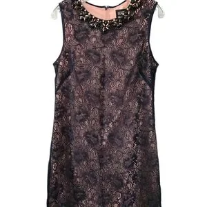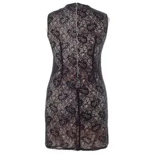 Elegant mini dress with intricate lace design. Features a sleeveless cut and a fitted silhouette. Perfect for evening events.